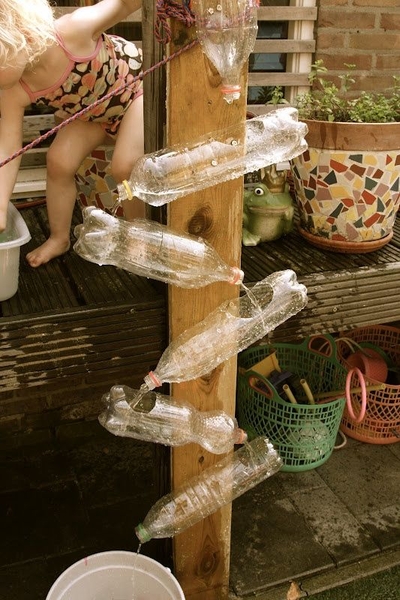 Trò chơi này giúp trẻ phát triển vận động tinh thông qua 2 hoạt động chính là múc nước và đổ nước. Ngoài ra bạn có thể tạo ra thêm những chi tiết thú ví để tăng sự hứng thú của trẻ bằng cách: đặt thêm sỏi, đá hoặc những đồ chơi nhỏ vào phía bên trong của chai; pha thêm màu để tạo ra thác nước màu sắc; đục nhiều lỗ nhỏ để tạo hiệu ứng mưa rơi…